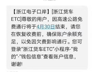 今天,很多浙江ETC用戶卡友收到同樣一條短信,短信的內(nèi)容大致是:因高速公路免費通行將于4月30日結(jié)束,請大家保持賬戶余額充足。
