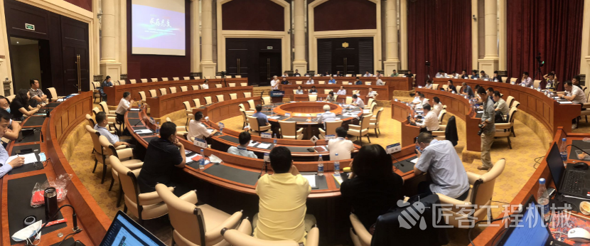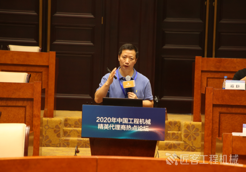 中國(guó)工程機(jī)械工業(yè)協(xié)會(huì)代理商工作委員會(huì)秘書(shū)長(zhǎng)、匠客工程機(jī)械傳媒總經(jīng)理?xiàng)钪痉贾鞒稚衔绲臅?huì)議并發(fā)言