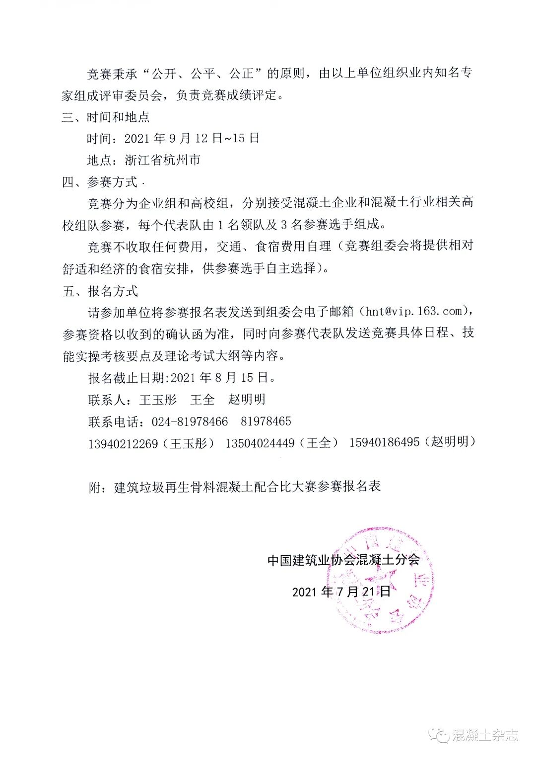 為配合《住房和城鄉(xiāng)建設(shè)部關(guān)于推進(jìn)建筑垃圾減量化的指導(dǎo)意見》(建質(zhì)〔2020〕46號)的發(fā)布,進(jìn)一步推動混凝土行業(yè)建筑垃圾消納和碳減排,為我國2030年前實(shí)現(xiàn)碳達(dá)峰、2060年前實(shí)現(xiàn)碳中和的目標(biāo)做出混凝土行業(yè)的貢獻(xiàn),現(xiàn)決定于2021年9月12日~15日于浙江省杭州市舉辦建筑垃圾再生骨料混凝土配合比大賽。