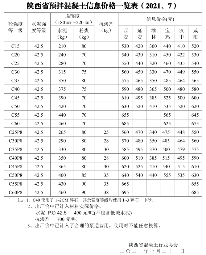【市場(chǎng)】陜西省預(yù)拌混凝土信息價(jià)格一覽表(2021.7)