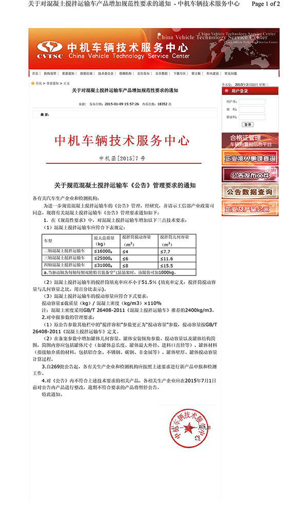 根椐國家有關(guān)依法治國的精神,嚴格執(zhí)行國家法律、標準的有關(guān)規(guī)定,中機車輛技術(shù)服務(wù)中心根據(jù)中國工業(yè)信息化部產(chǎn)業(yè)政策司意見,印發(fā)中機函[2015]7號文向相關(guān)單位下發(fā)。此文明確了混凝土攪拌運輸車三點技術(shù)要求(原文見附件),并于2015年7月1日前對公告產(chǎn)品進行整改,逾期者將暫仃公告。椐此,特向全國廣大攪拌運輸車生產(chǎn)商和使用者予以提示,希望大家認真嚴格執(zhí)行。