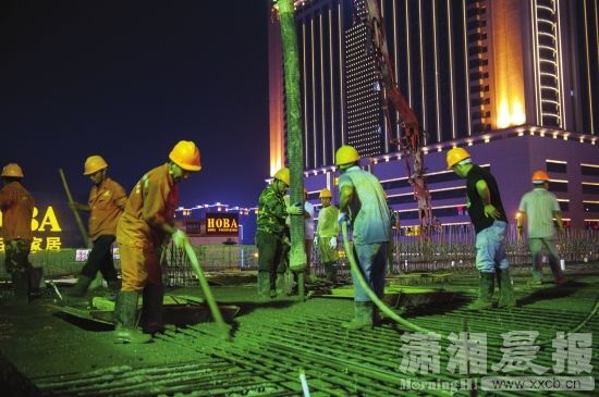 8月15日晚,長(zhǎng)沙市萬(wàn)家麗路與荷花路交會(huì)處附近,工人正給即將貫通的橋面澆筑混凝土。圖/瀟湘晨報(bào)記者 陳韻驕