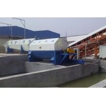 該系統(tǒng)主要由:攪拌車加水清洗裝置,溜槽輸送裝置,砂石漿水分離裝置,和泥漿水后處理裝置組成。混凝土輸送設(shè)備清洗后,將殘余混凝土排入溜槽中,在高壓水流沖擊下,經(jīng)溜槽進(jìn)入砂石分離機,在不斷旋轉(zhuǎn)的分離機作用下,對混凝土進(jìn)行充分的清洗,同時將砂、石進(jìn)行分離,分離后的砂、石在導(dǎo)料葉片的作用下背向流動,再通過提升式出料口排出分離機,分別堆放。清洗后的漿水從分離機的底部排出進(jìn)入沉淀池逐級沉淀后循環(huán)使用或進(jìn)入攪拌池回收利用。進(jìn)入攪拌池(一般情況2個攪拌池)的漿水為了防止沉淀凝固,需通過攪拌器的作用,攪拌器的工作為間歇式。分離出水泥漿在連續(xù)的攪拌器作用下,再通過高壓污水泵輸送到攪拌樓中待生產(chǎn)計量再利用。整個控制系統(tǒng)設(shè)有手動和自動控制,方便控制設(shè)置,整個系統(tǒng)運行可靠,故障率低,維護(hù)量少等特點。