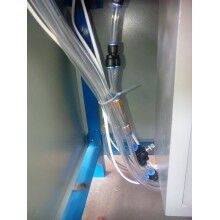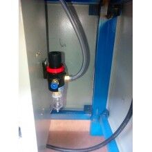 將膩子粉包裝袋套在出料嘴上,撥動彈簧開關,壓袋氣缸開始工作并壓住袋口,控制器將包裝袋重量自動去除,通過空壓機的氣流經三分管分成三路,其中一路去往進料口進行破拱,保證下料暢通。葉輪高速轉動迅速將物料撥出灌入袋中,隨袋中空氣一起溢出的粉塵經排氣孔排出(對環(huán)保要求高的用戶也可連接吸塵器,由除塵器吸走)。待加料達到粗流設定值(L1)時,氣缸自動將橡膠軟管夾至1/2開口,出料速度減慢,到總設定(L2)時,氣缸將橡膠軟管完全夾死,出料停止,壓袋氣缸松開袋口,灌裝結束。