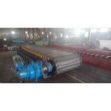 其次,重型板式給料機堅固耐用、使用壽命長,維修量小,開停機方便,運行穩(wěn)定可靠。該機常用在原料倉底部,由于可直接承受礦倉中礦石的巨大壓力,原料礦倉可適當做的大一些,可儲存較多礦石,保證給料均勻平穩(wěn),后續(xù)破碎工作運行可靠,有利于保護后續(xù)設備的正常運轉(zhuǎn),不會出現(xiàn)瞬間斷料或瞬間溢料的情況。在水泥礦山中此設備常傾斜安裝,最大傾角已經(jīng)可達到25°,這就使給料機所承受的物料的重量在沿給料機長度方向上產(chǎn)生一個分力, 從而給料機實際承受的物料壓力遠小于物料實際的重力,大大減輕了給料機的負荷。由于給料機安裝傾角較大,一方面在設備開停機時,可以保證倉內(nèi)的礦石不會順著給料機料槽滾落到破碎機中;另一方面,設備工藝配置上可減小高差,在生產(chǎn)線選址時,場地適應性更強,并可避免原料卸礦平臺過高,而使原礦向高處輸送,增加輸送成本。
